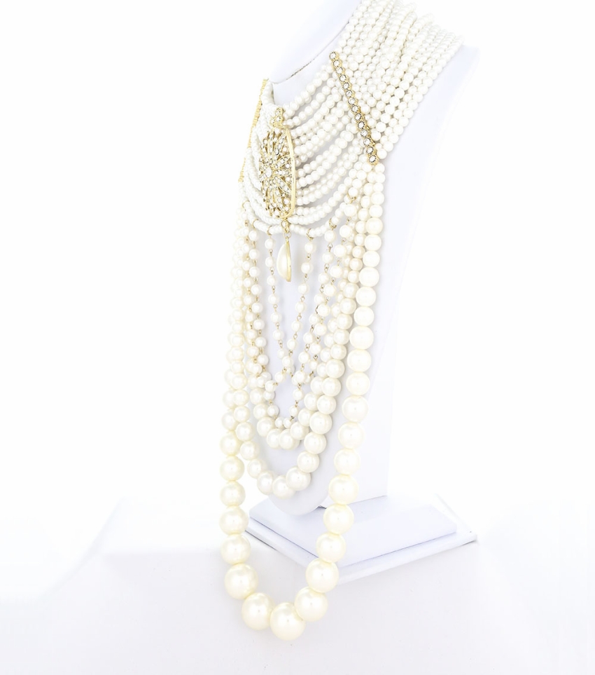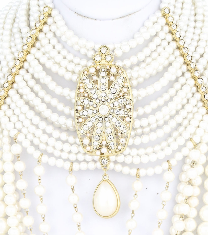 This beautiful Statement Gatsby Signature Line Multi-Strand Pearl Extravaganza Choker Necklace with earrings is great for a top with NO collar, an open blouse top, or a plain dress. Let this beautiful statement necklace be your piece to make a bold mind blowing statement.