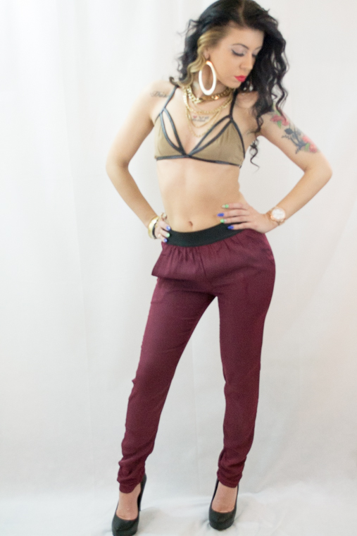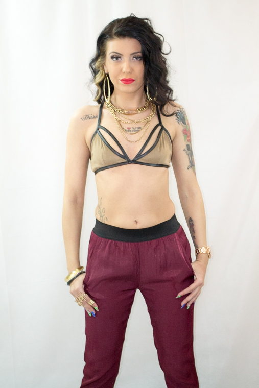 Bralette in Mocha features black tone hardware, adjustable spaghetti straps, cutout details along bust, and stretchy faux suede fabric.