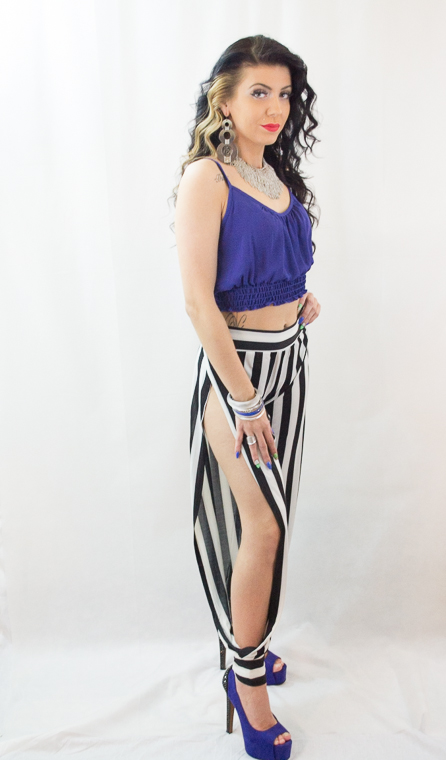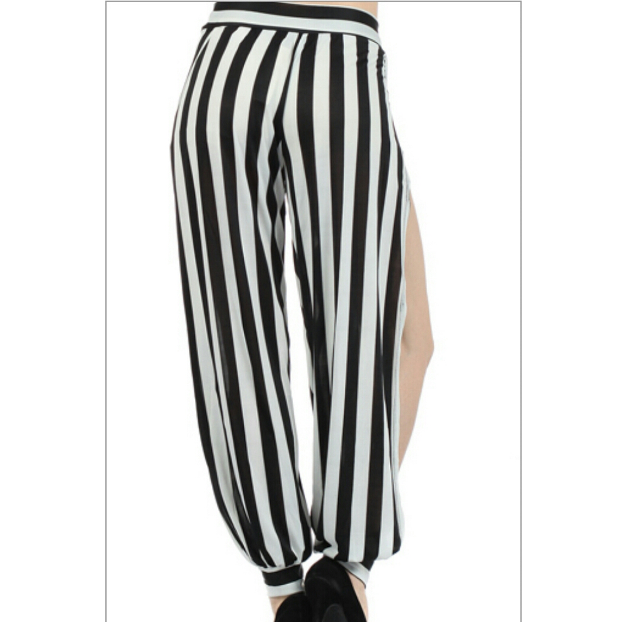 THESE STRIP BANDED TROUSERS HAVE OPEN SLITS FROM HIP TO ANKLE, AND HAVE A BIT OF SHEER TO THEM